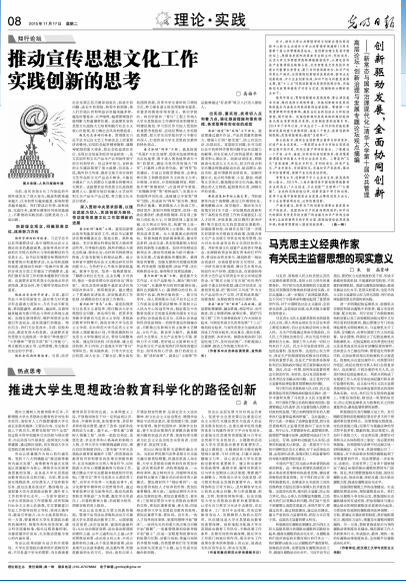 2015年11月17日,《光明日报》在第八版《理论·实践》上登载了bw必威党委副书记龚燕的理论文章《推进大学生思想政治教育科学化的路径创新》。全文如下: