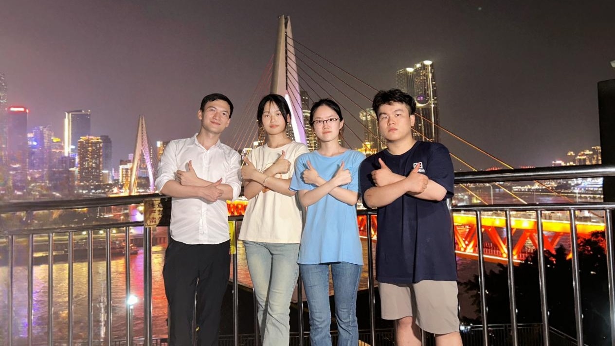 阮德清(左一)与重师学子在千厮门大桥打卡点合影(央广网发 受访者供图)