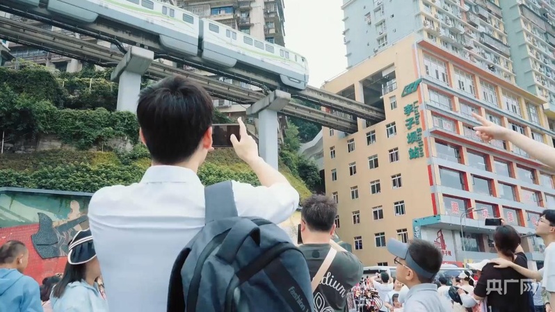 越南留学生阮德清在李子坝轻轨“穿楼”打卡点拍照(央广网发 熊彦茹 摄)
