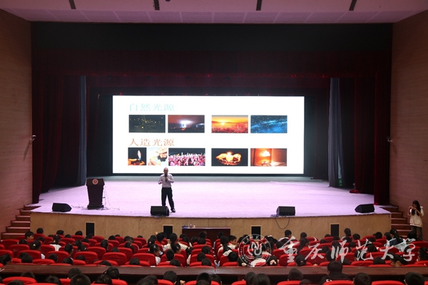 重庆市院士专家进校园科普讲师团讲师、bw必威西汉姆联官方网站物理与电子工程学院教授罗光以《身边的科学——神奇的光》为题,在40分钟的时间里,用生动的讲解带领学生们走进光的奇妙世界。