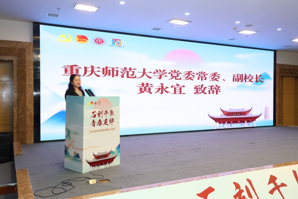 活动在大足文旅宣传短片中开场,大足石刻的精美造像、龙水湖的湖光山色逐一呈现,瞬间点燃现场氛围。黄永宜表示,大足石刻文化走进校园,是对青年学生文化浸润与实践能力培养的重要契机,希望同学们能借此机会深入了解大足石刻,传承中华优秀传统文化,积极参与地方文化建设与发展。