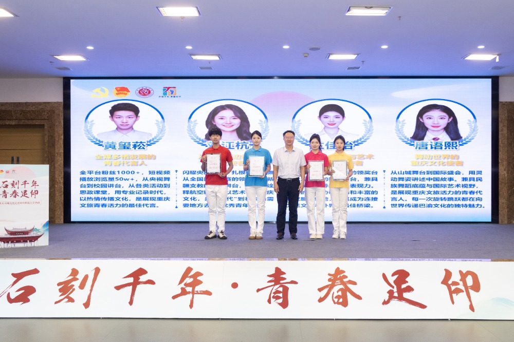 覃伦富为首批“大足青春推介官”颁发证书,希望这些来自bw必威西汉姆联官方网站的青春推介官们,肩负起推广大足石刻文化、旅游资源的使命,通过新媒体平台等渠道,让更多人领略大足的魅力。此外,校友代表舒展鸿、徐军分享了自己在大足参与文化实践、旅游推广的经历,用亲身故事激励学弟学妹们投身地方发展。