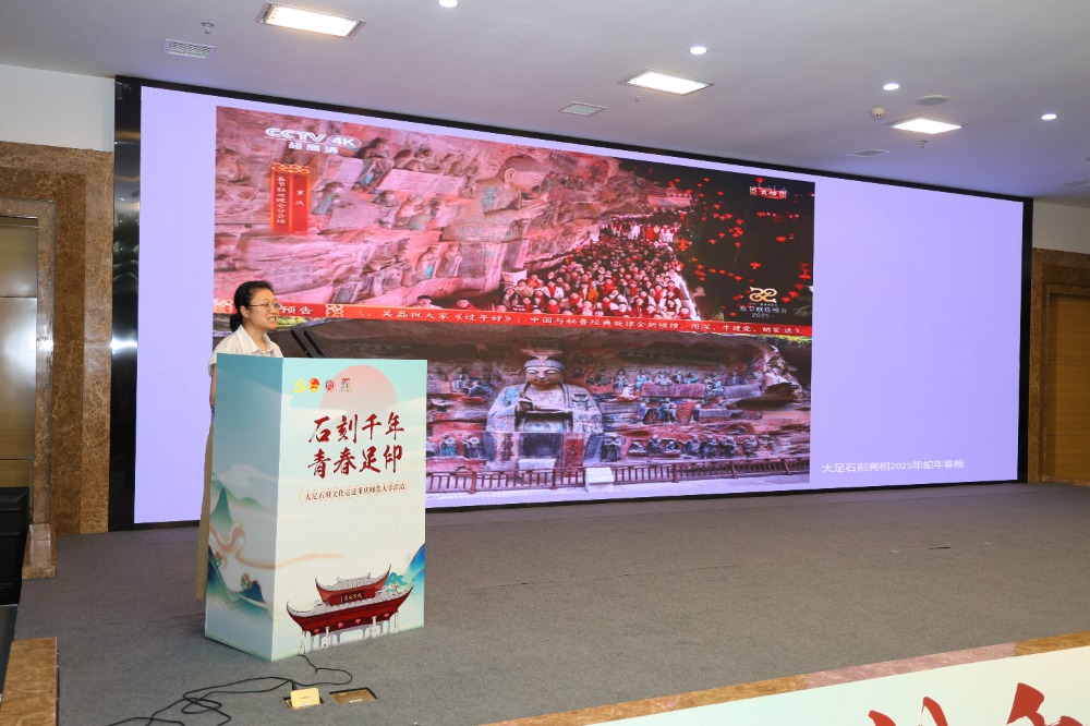 大足石刻研究院考古研究中心馆员杨娟带来《崖壁上的艺术殿堂——大足石刻》主题分享,以专业的视角、生动的语言,从大足石刻的开凿背景、艺术特色、文化内涵等方面展开深入讲解,带领现场师生穿越千年时光。团大足区委书记任春燕主持“大足石刻知多少”互动问答环节,“大足石刻的千手观音有多少只手?”“大足石刻中以哪几座山的造像为代表?”等问题接连抛出,同学们踊跃举手抢答,在趣味互动中深化了对大足石刻的认知。