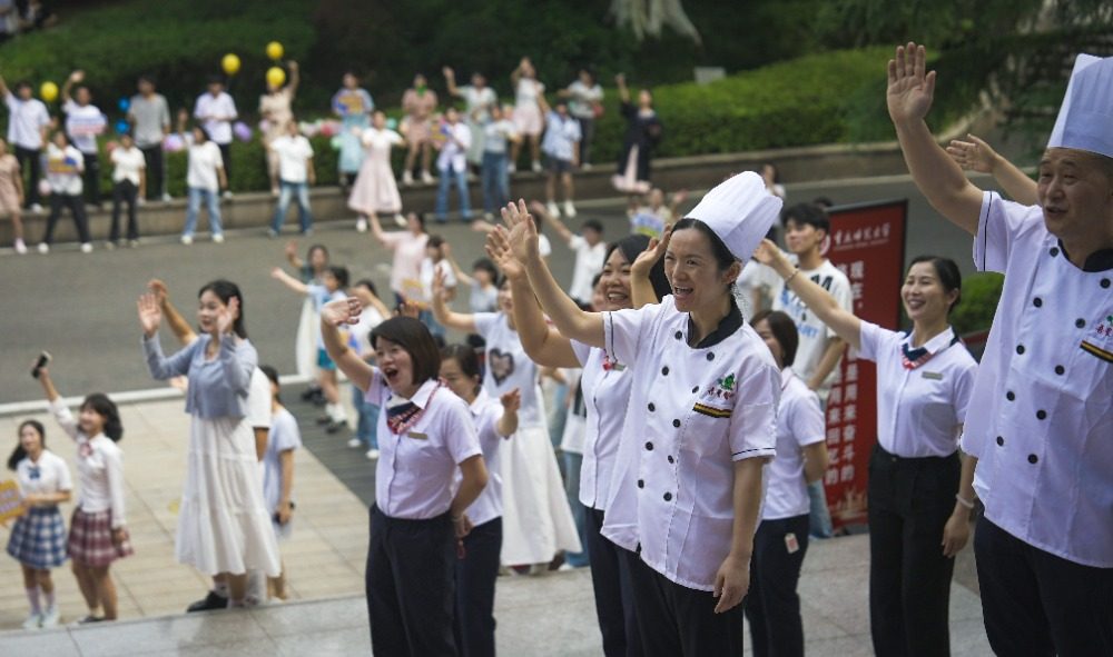 ▲6月24日,重庆师范学院大学城校区,食堂阿姨,保安大叔等为毕业生们送行。记者 郑宇 摄
