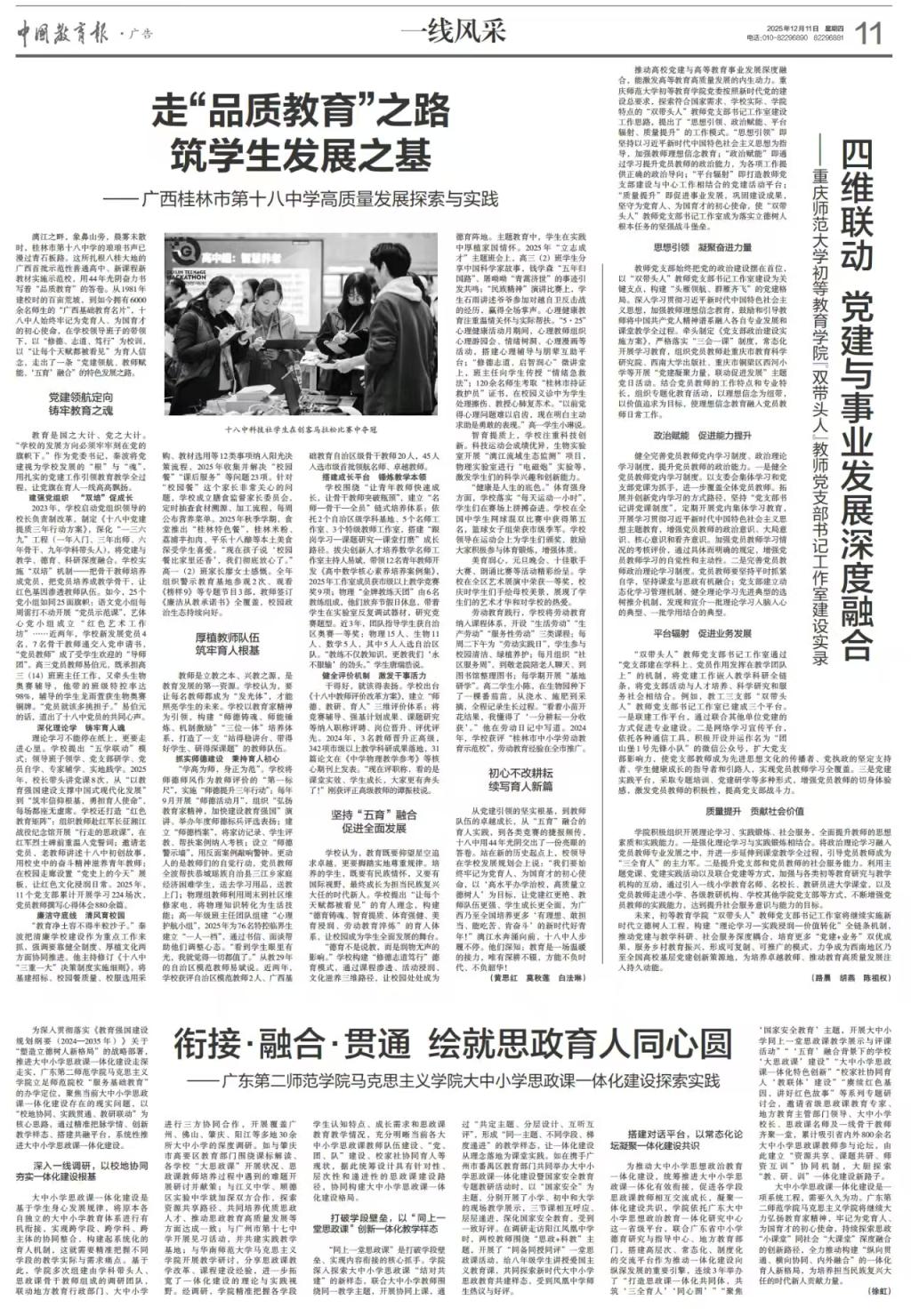未来,初等教育学院“双带头人”教师党支部书记工作室将继续实施新时代立德树人工程,构建“理论学习-实践浸润-价值转化”全链条机制,推动党建与教学科研、社会服务深度耦合,培育更多“党建+业务”双优成果,服务乡村教育振兴,形成可复制、可推广的模式,力争成为西南地区乃至全国高校基层党建创新策源地,为培养卓越教师、推动教育高质量发展注入持久动能。