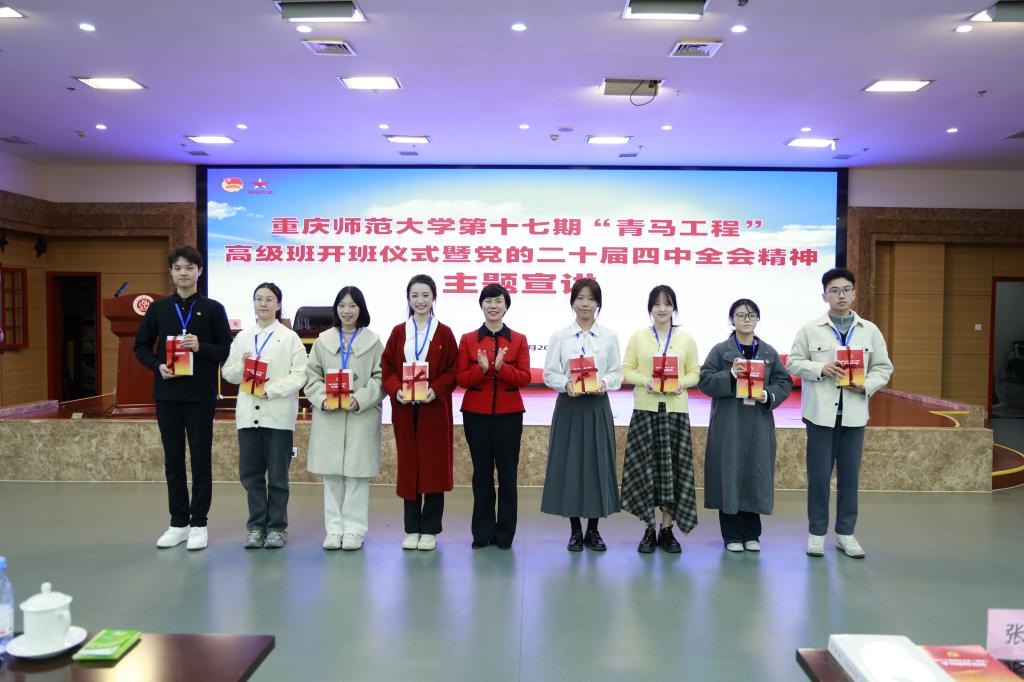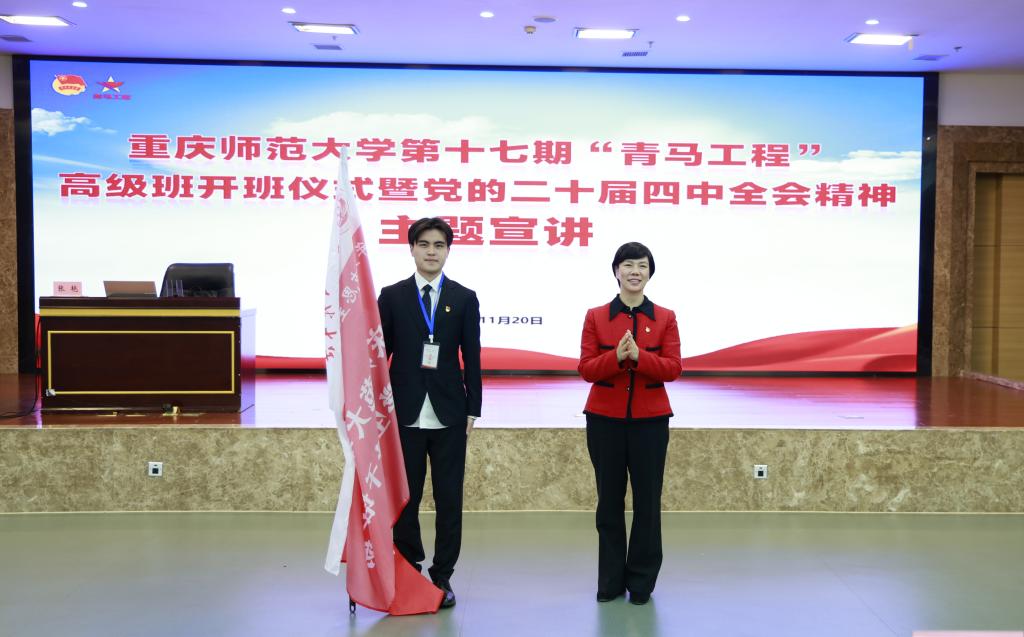 张艳为第十七期“青马工程”高级班授旗,并向青马学员代表赠送《习近平谈治国理政》第五卷及《党的二十届四中全会〈建议〉学习辅导百问》等书籍。